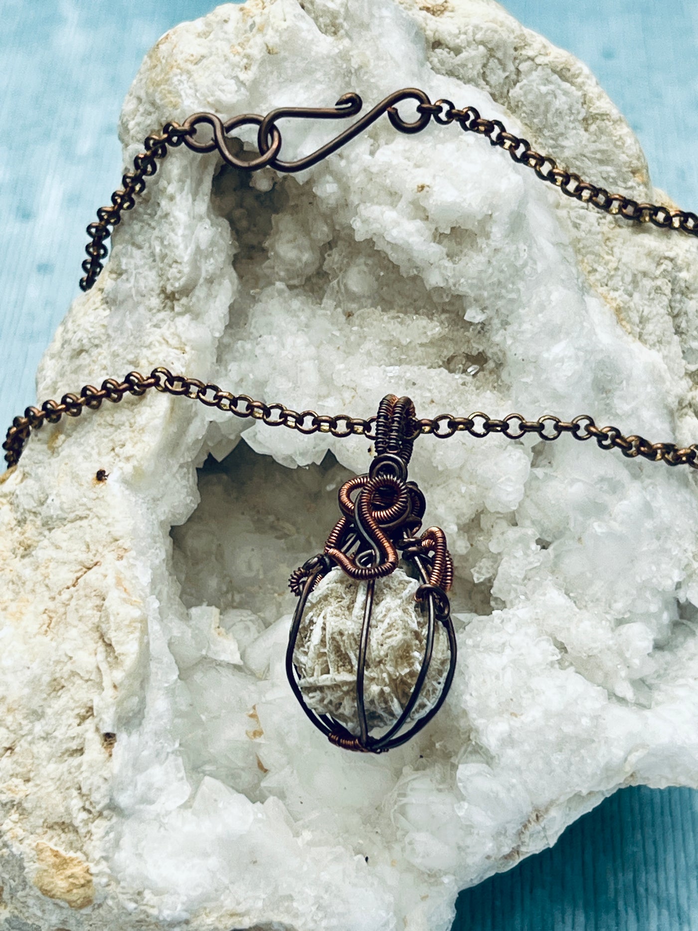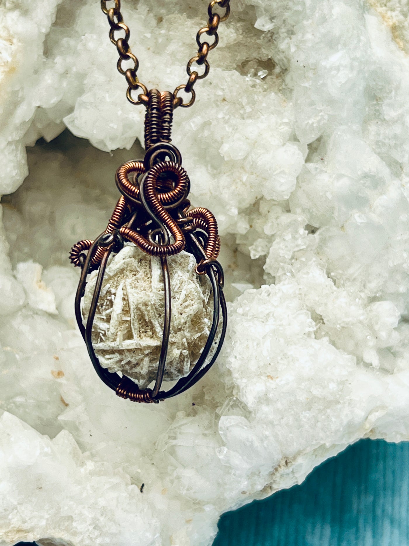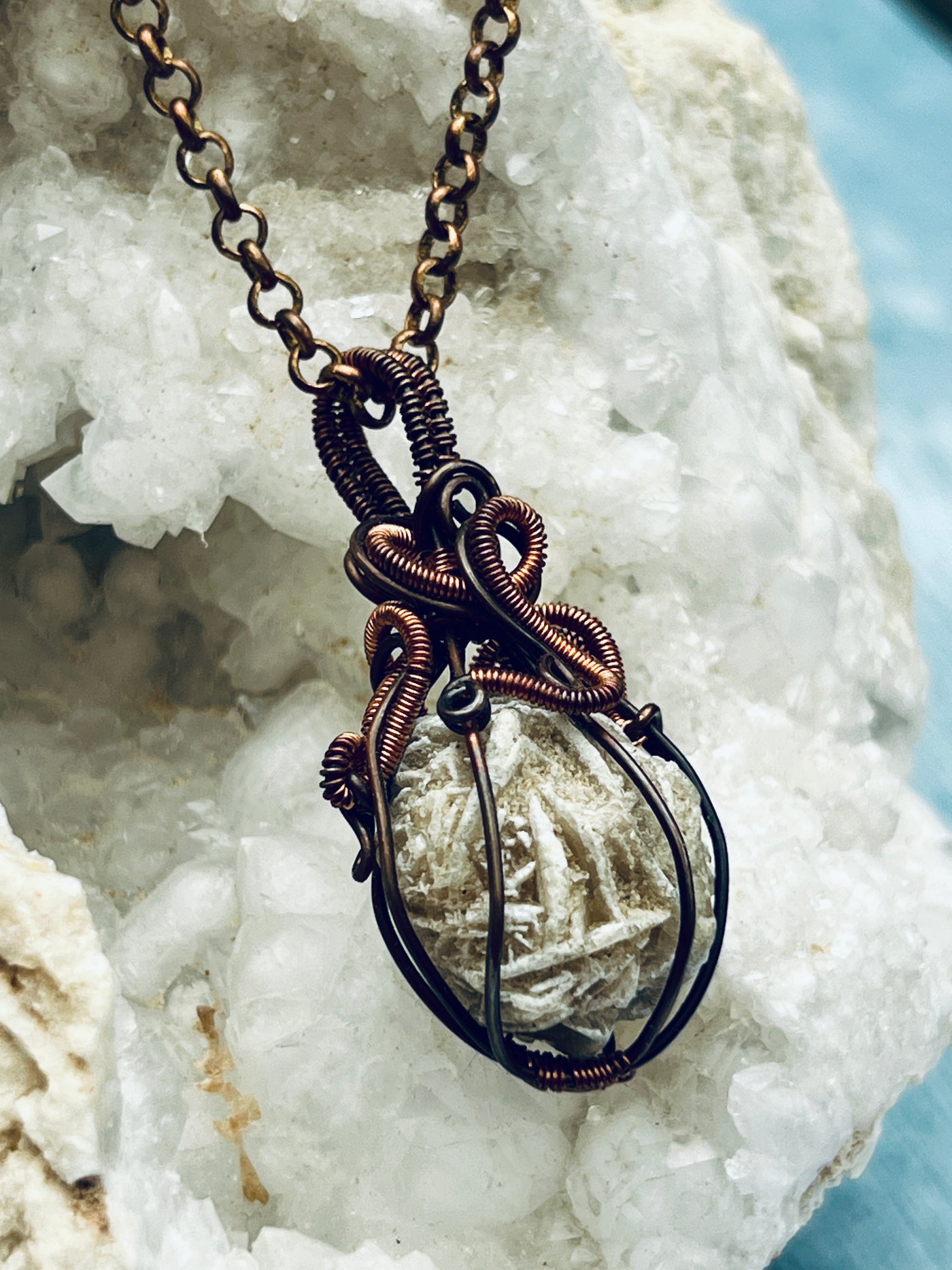 This handcrafted pendant features a striking desert rose stone cradled in artfully shaped copper metalwork. The warm, earthy tones of the stone are beautifully complemented by copper that develops a distinctive patina over time, adding character and depth. The sculptural design captures light from multiple angles, showcasing the stone's natural luminosity and rich coloring. Ideal for those who appreciate authentic gemstone craftsmanship, this piece serves as a meaningful accessory that brings natural warmth and timeless elegance to your everyday style.