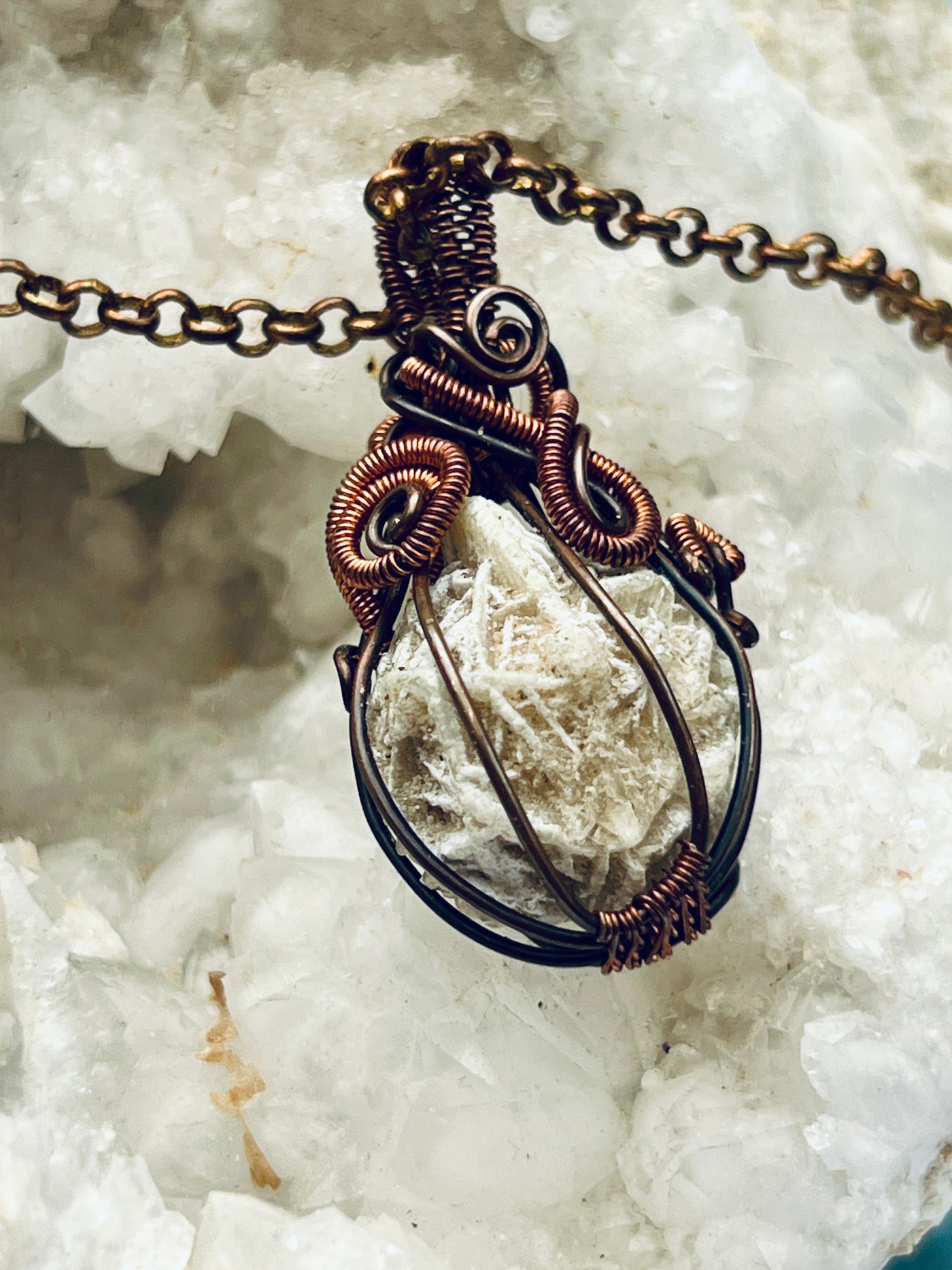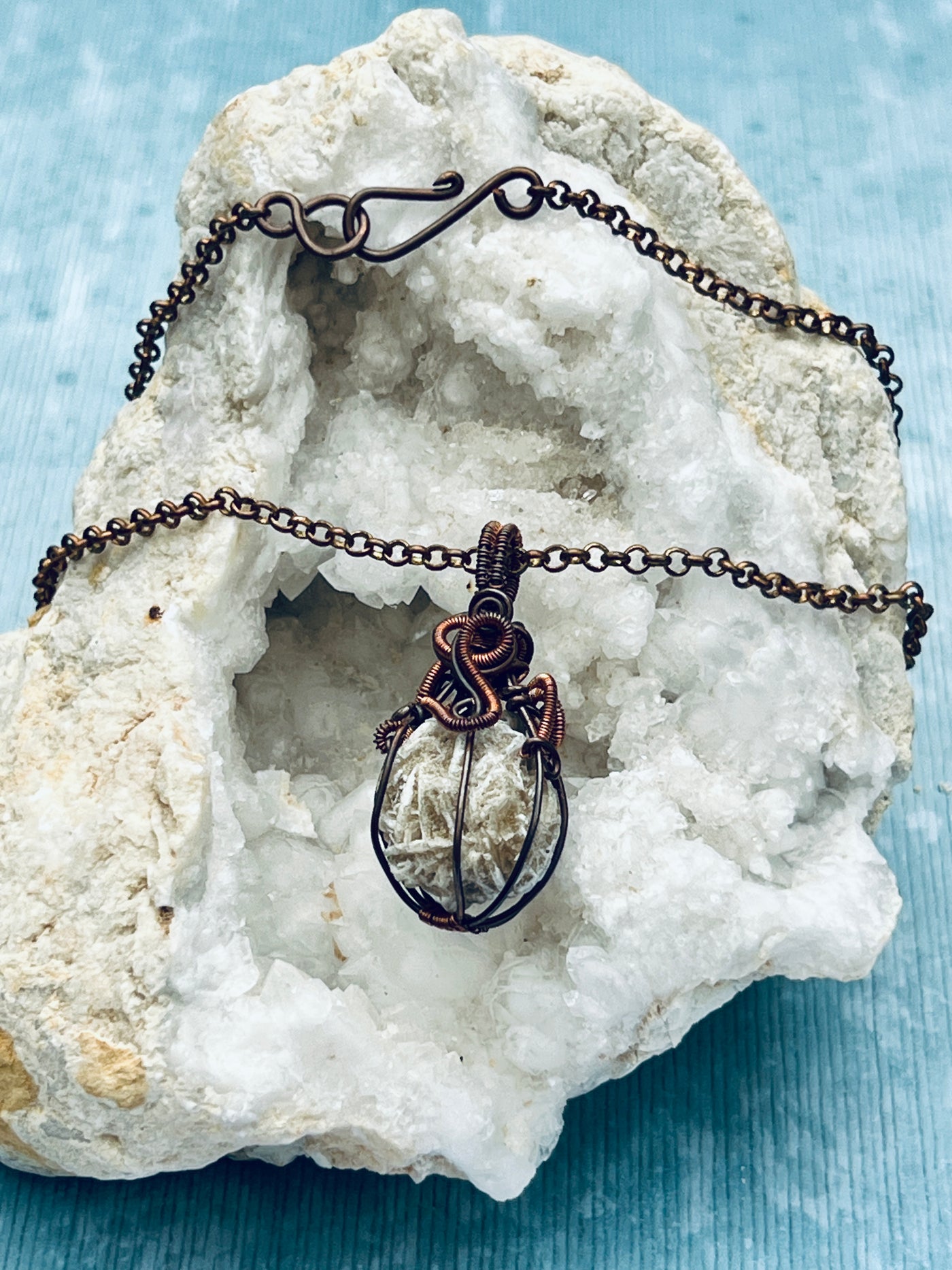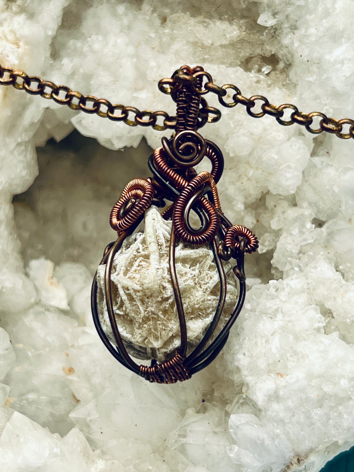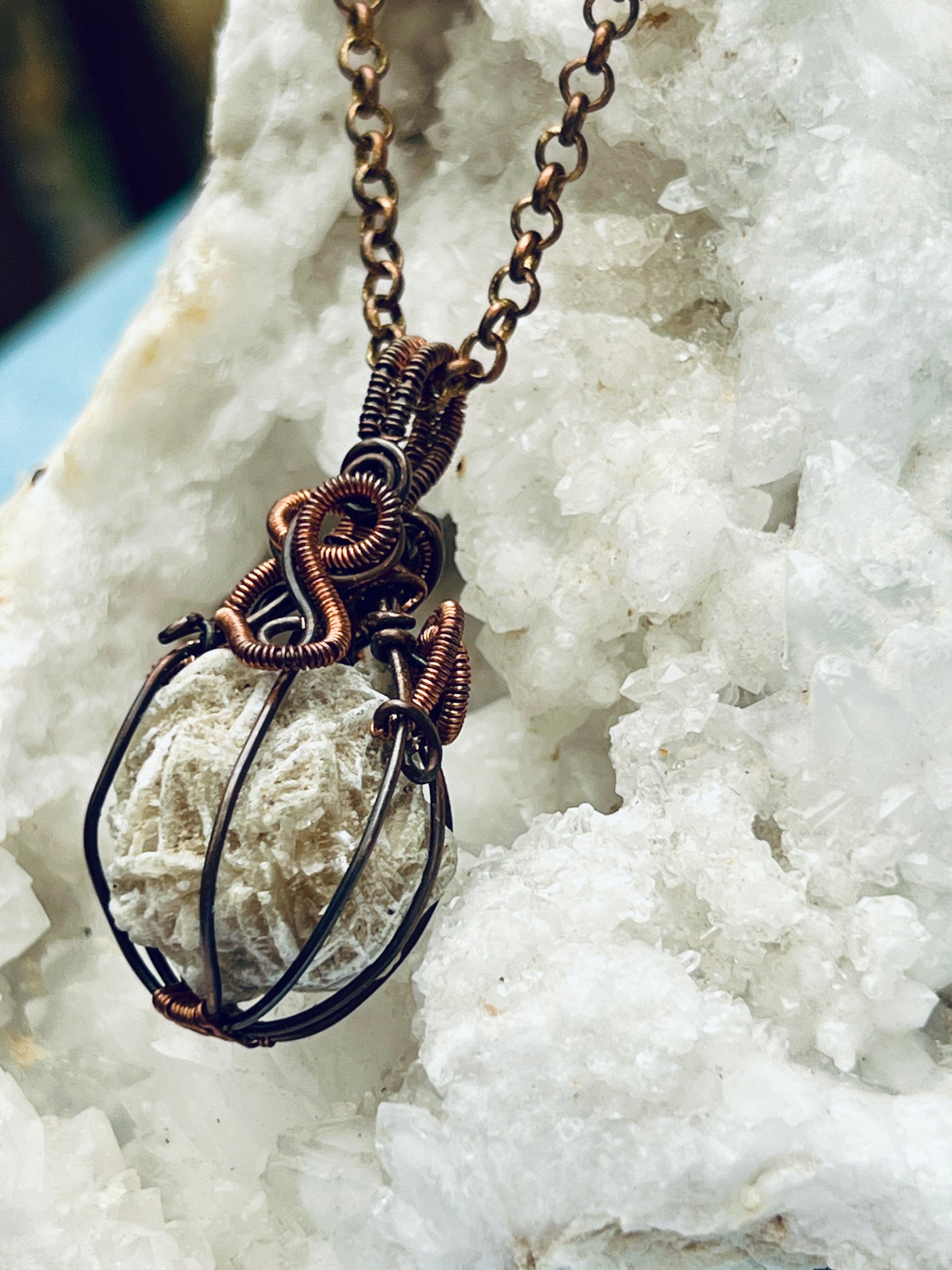 This handcrafted pendant features a striking desert rose stone cradled in artfully shaped copper metalwork. The warm, earthy tones of the stone are beautifully complemented by copper that develops a distinctive patina over time, adding character and depth. The sculptural design captures light from multiple angles, showcasing the stone's natural luminosity and rich coloring. Ideal for those who appreciate authentic gemstone craftsmanship, this piece serves as a meaningful accessory that brings natural warmth and timeless elegance to your everyday style.