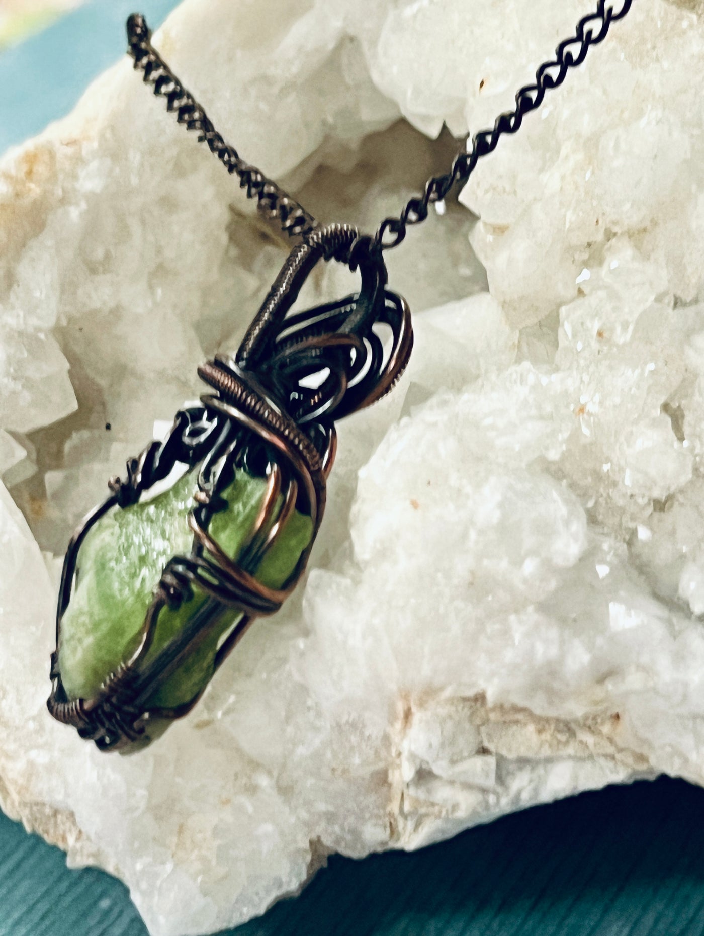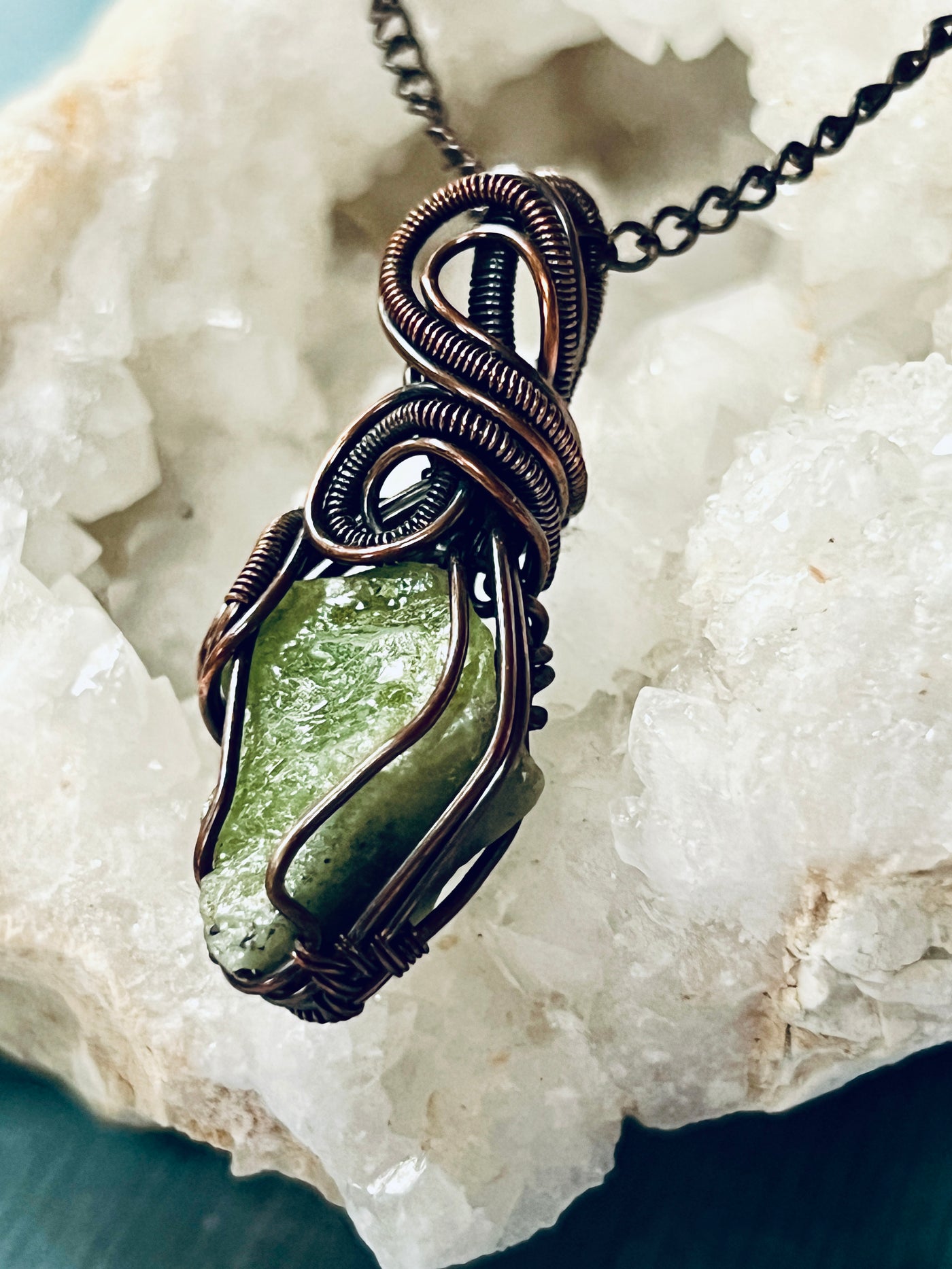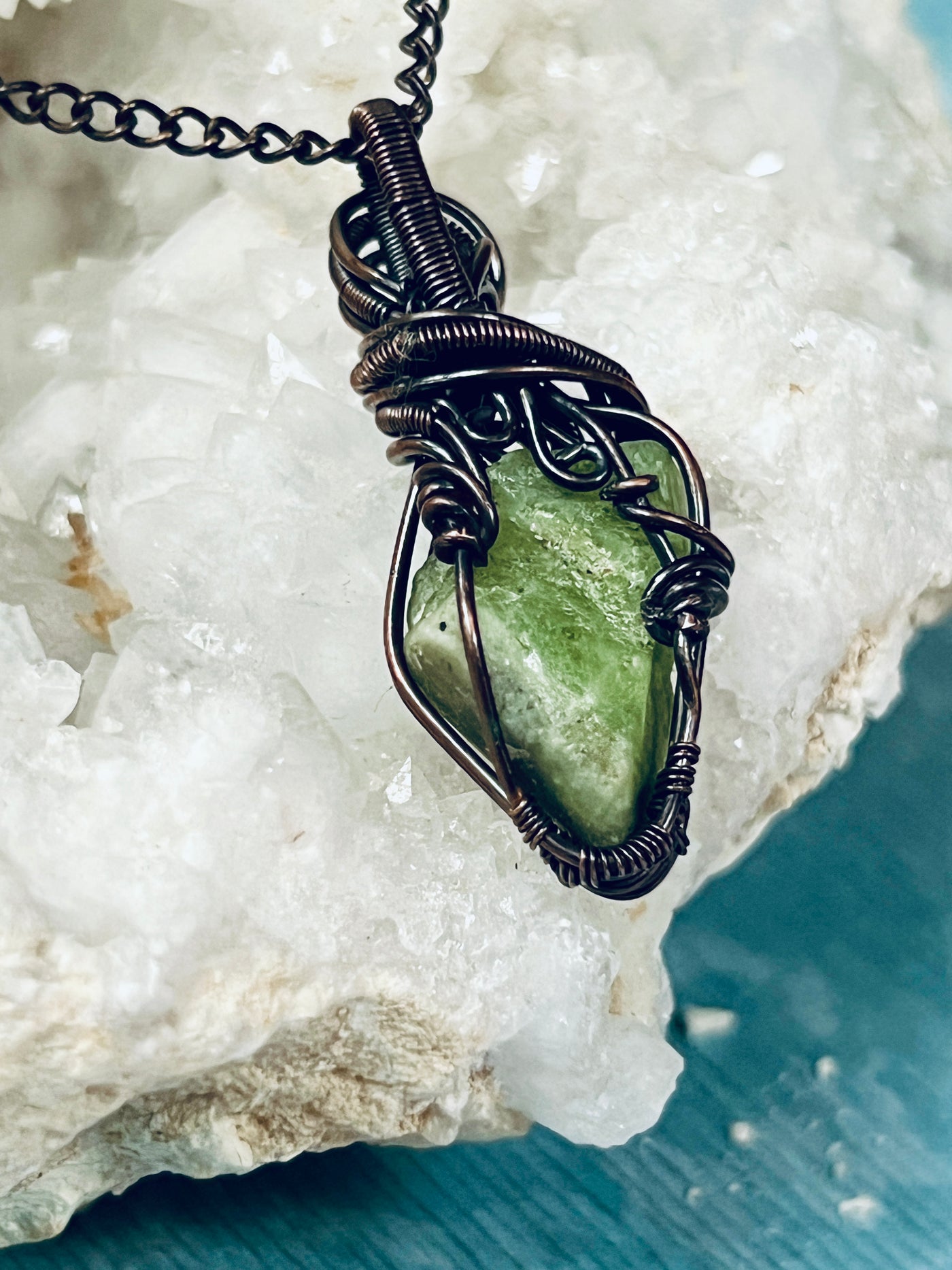 Radiate natural brilliance with this luminous copper-wrapped peridot pendant. The vibrant olive-green stone glows with an inner light, framed by skillfully shaped copper metalwork that enhances its gemstone beauty. Each handcrafted piece showcases the peridot's distinctive clarity and warmth, while the copper patina develops a rich character over time. The sculptural design catches light from every angle, revealing the stone's mesmerizing depth and color. Perfect for those drawn to gemstone jewelry with authentic craftsmanship and timeless appeal, this pendant becomes a signature accessory—a wearable celebration of natural elegance that brings warmth and positive energy to any collection.
