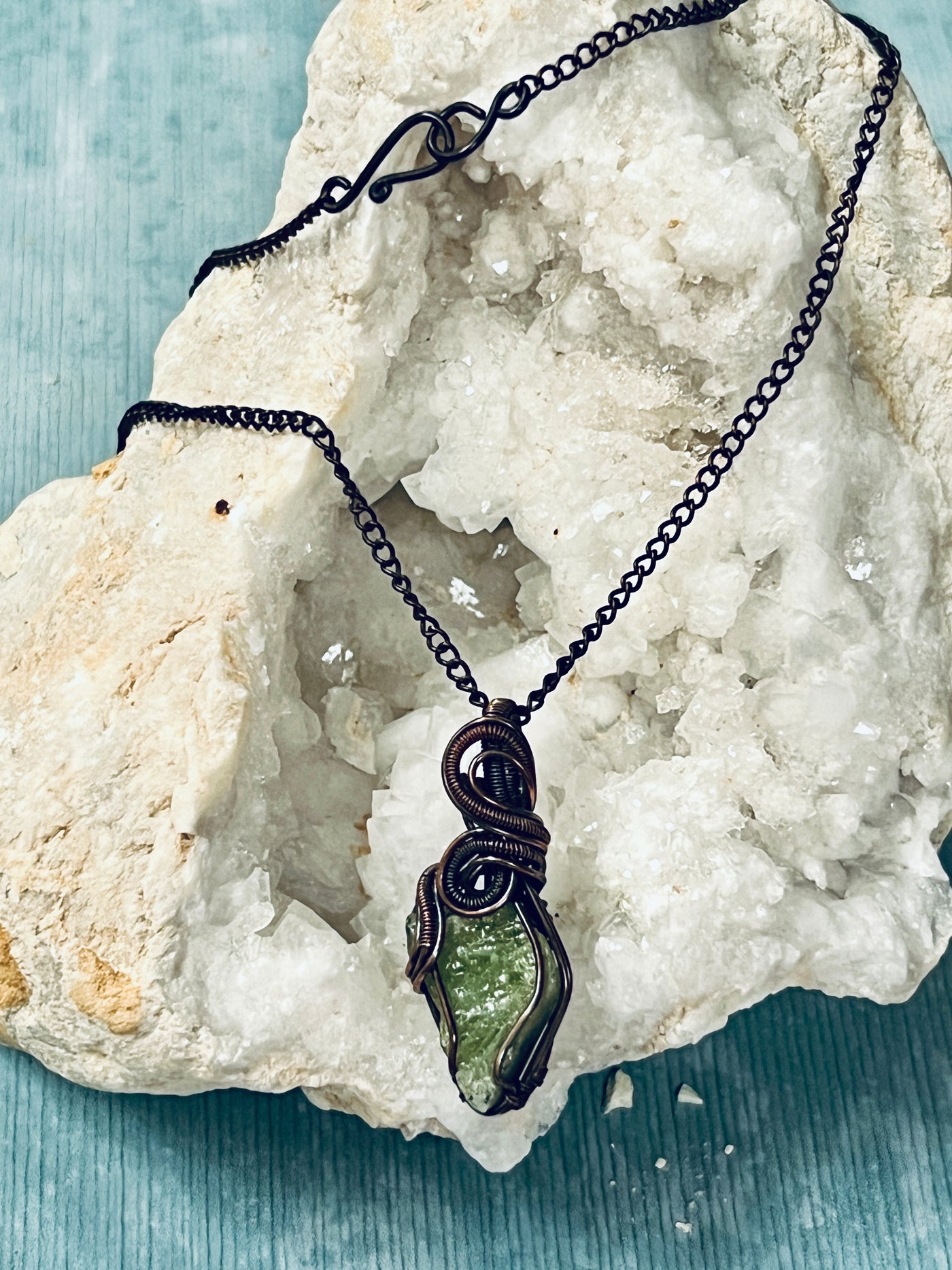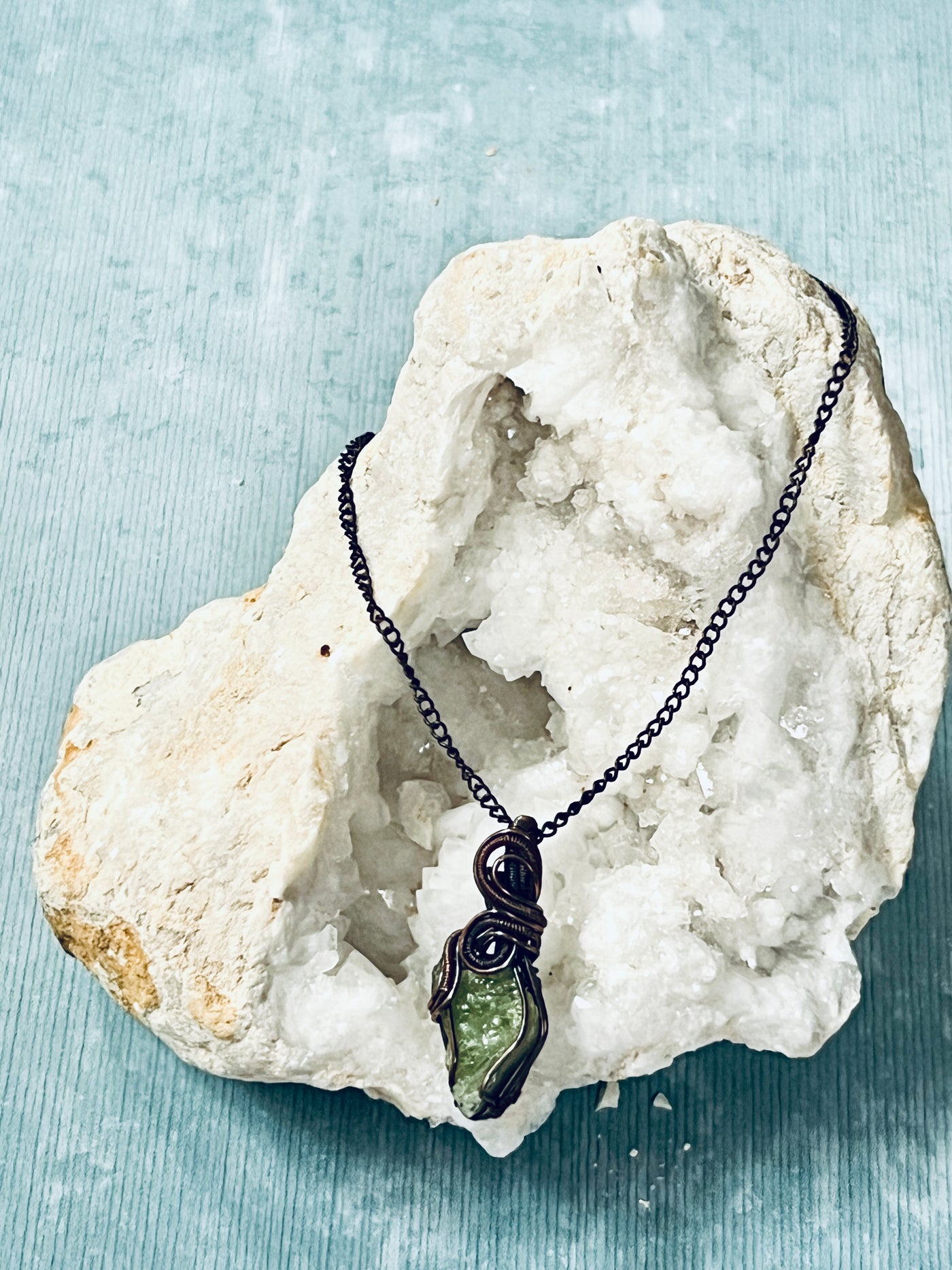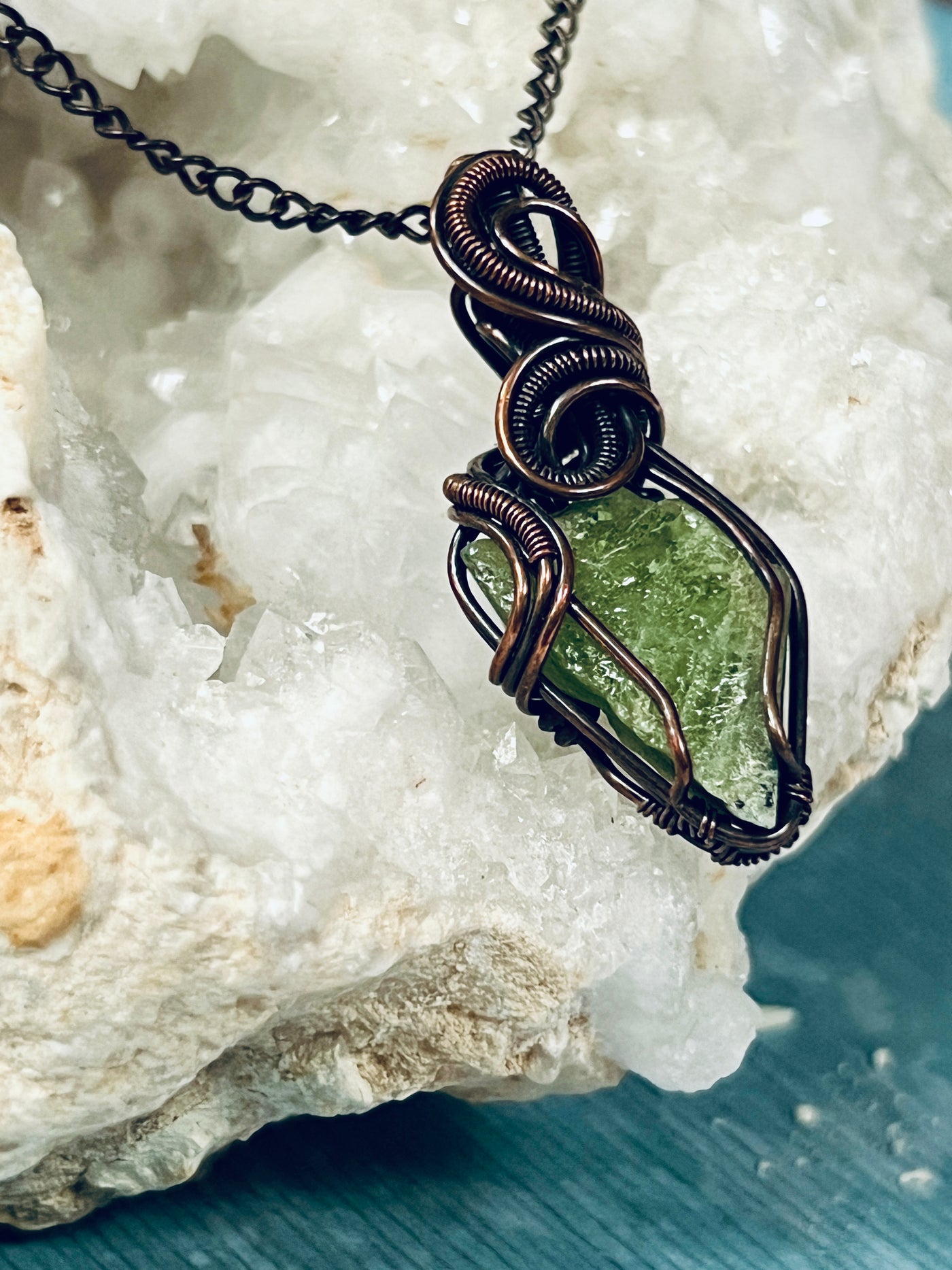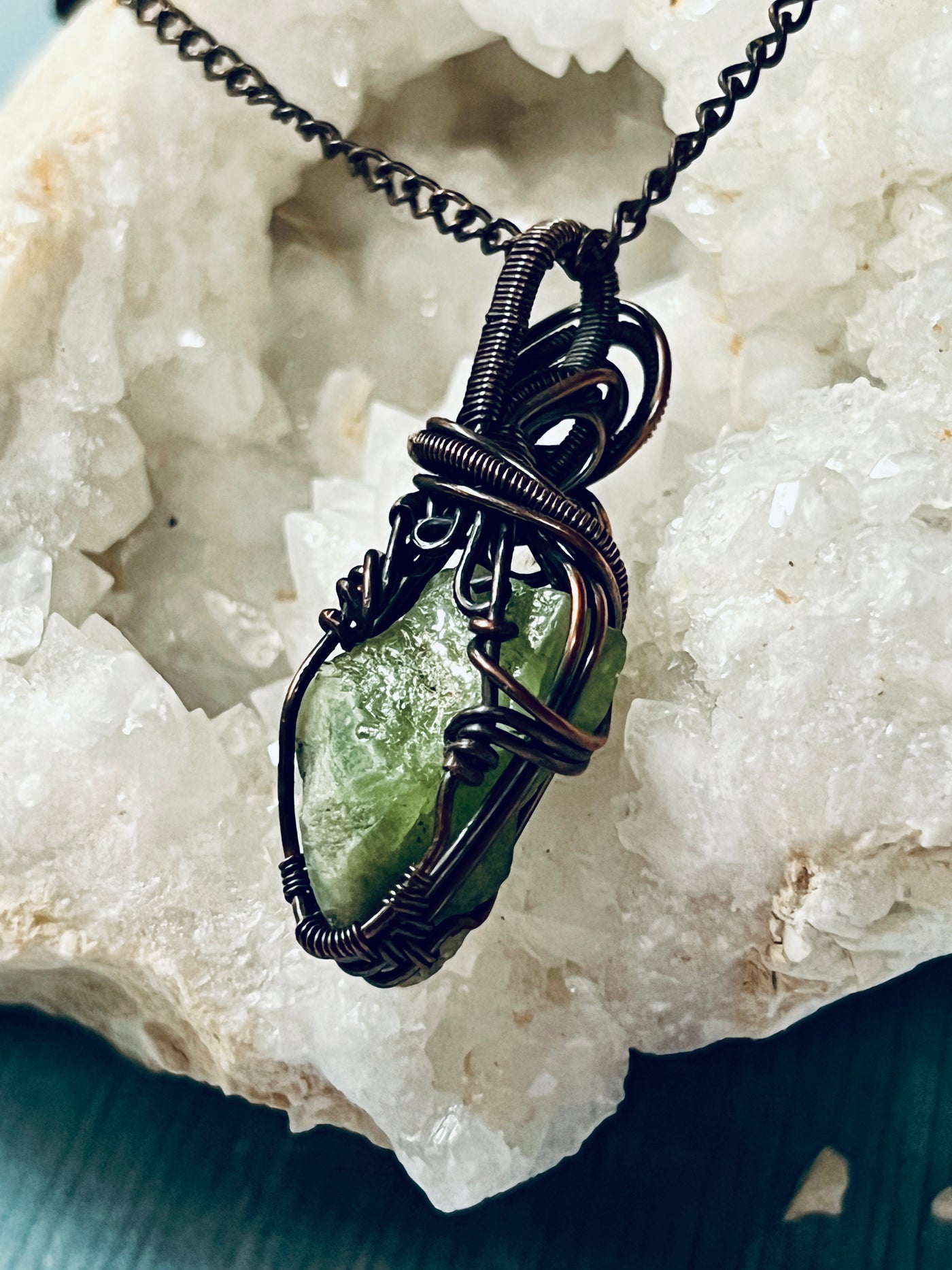 Radiate natural brilliance with this luminous copper-wrapped peridot pendant. The vibrant olive-green stone glows with an inner light, framed by skillfully shaped copper metalwork that enhances its gemstone beauty. Each handcrafted piece showcases the peridot's distinctive clarity and warmth, while the copper patina develops a rich character over time. The sculptural design catches light from every angle, revealing the stone's mesmerizing depth and color. Perfect for those drawn to gemstone jewelry with authentic craftsmanship and timeless appeal, this pendant becomes a signature accessory—a wearable celebration of natural elegance that brings warmth and positive energy to any collection.