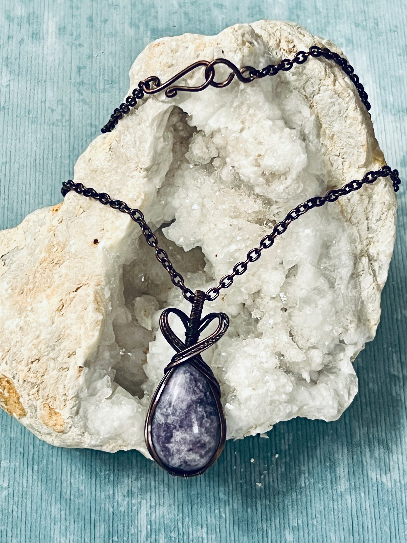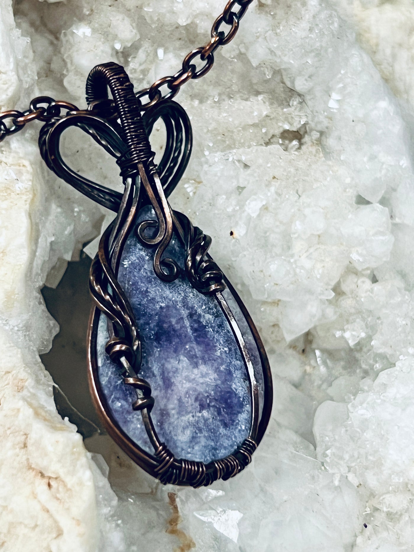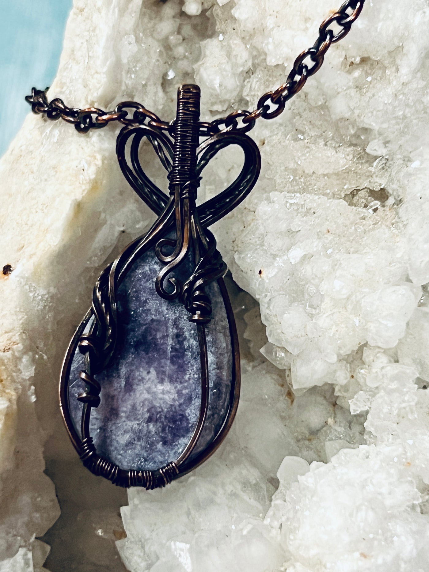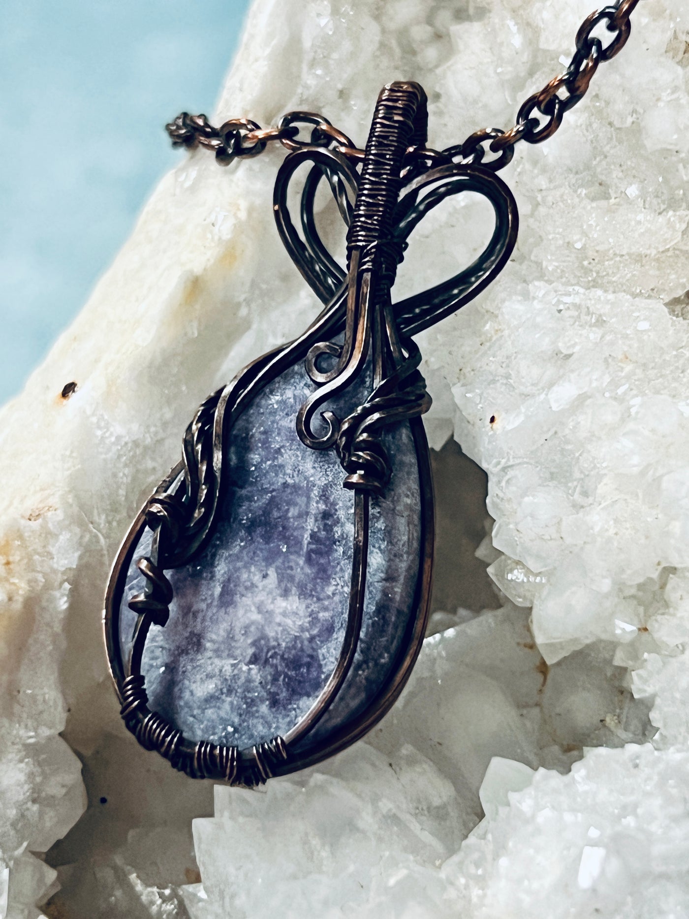 Embrace the serene beauty of lepidolite in this handcrafted pendant, where copper artistry frames the stone's delicate lavender tones and natural formations. The expertly wrapped design showcases lepidolite's calming aesthetic while the copper setting ages into a distinctive patina that enhances the piece's character. This is more than an accessory—it's a wearable expression of your connection to nature's refined elegance and skilled craftsmanship. As your pendant matures with time, it becomes increasingly personal, developing a warm richness that reflects your journey. Own a one-of-a-kind treasure that honors authentic materials and transforms beautifully with every wear.